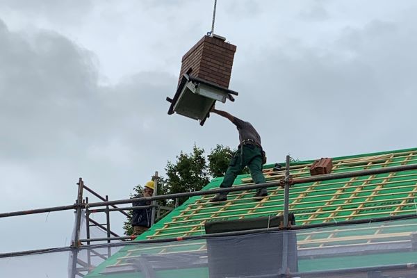 Woningverduurzaming in Leiden, met prefab dakplaten en prefab sierschoorstenen. Ook de nieuwe dakgoot wordt er in lengtes van 12 meter kant en klaar aangehangen.