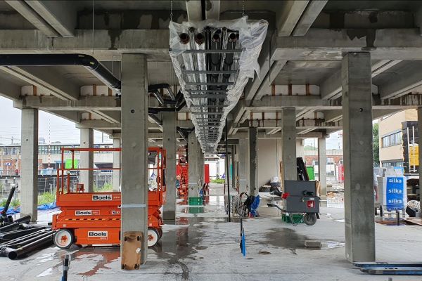 Bij de bouw van het Moxy hotel worden ook de installaties, zoals complete leidingstraten, grotendeels geprefabriceerd aangeleverd. Marc van Delft: “We engineeren, tekenen, coördineren en realiseren hier de sprinkler/werktuigkundige installaties vanuit een modulaire insteek. Dat zorgt voor een hogere kwaliteit en minder risico’s.”