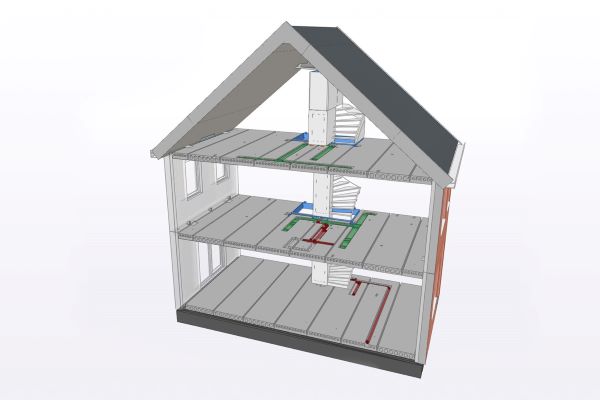 In één dag een standaard woning monteren. Met een verdiepingsvloer waarin de prefab installatie-elementen voor verwarming, warm water, ventilatie en riolering zijn opgenomen.