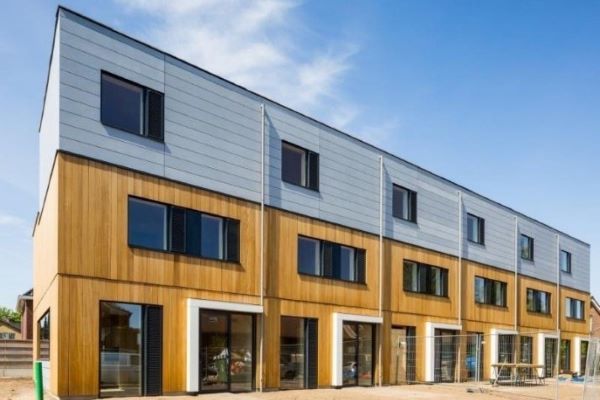 In de Hengelose Es zijn 4 bijzondere houtbouwwoningen opgeleverd. Gebouwd met kant-en-klare modules met woonkamer, keuken, entree/n toilet en slaapkamers. Elke dag ontstond zo een complete woning van 150 m2.
