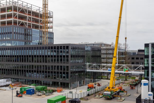 Tussen de door cepezed ontworpen gebouwen Genmab en Accelerator op het Utrecht Science Park is recent een 32 meter lange luchtbrug geplaatst. Een geprefabriceerde staalconstructie die secuur tussen de gebouwen is ingehesen.